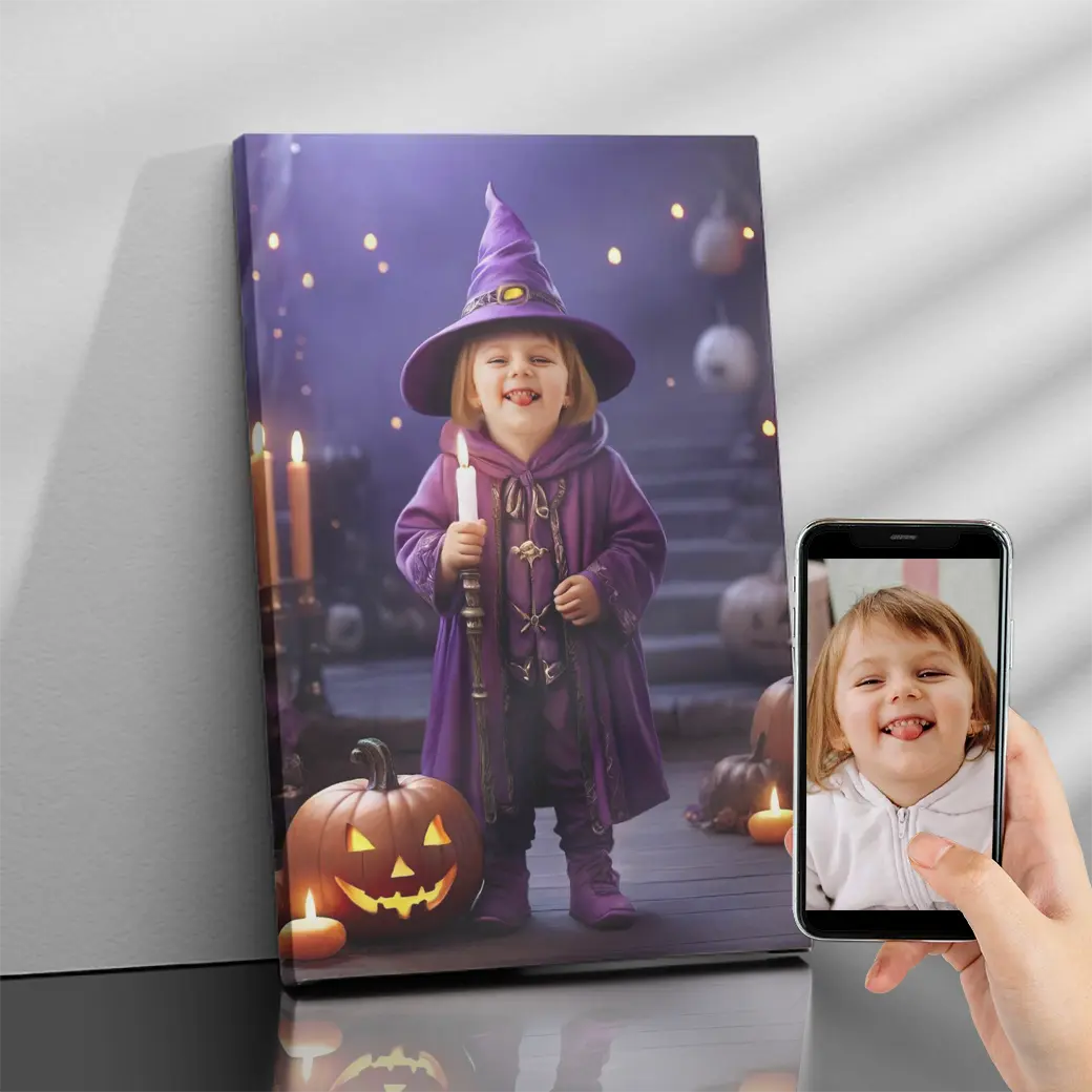 Introducing the Purple Potion Master! This magical Halloween portrait turns your child into a charming little wizard brewing up potions and spells. Surrounded by a spooky yet whimsical Halloween setting, this personalized artwork is perfect for capturing Halloween memories and adding a touch of enchantment to your decor. Just upload a photo, and our talented team will craft a unique piece that brings your child’s Halloween dreams to life. Ideal as a keepsake or a one-of-a-kind gift, the Purple Potion Master portrait is sure to bewitch anyone who sees it!
